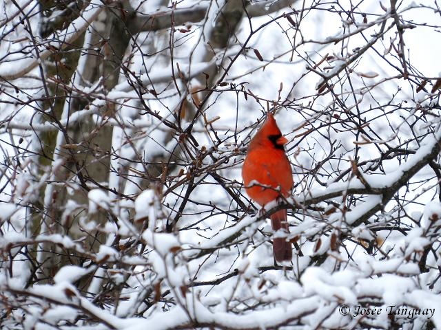 Un beau cardinal rouge ce matin au jardin avec la première neige.
